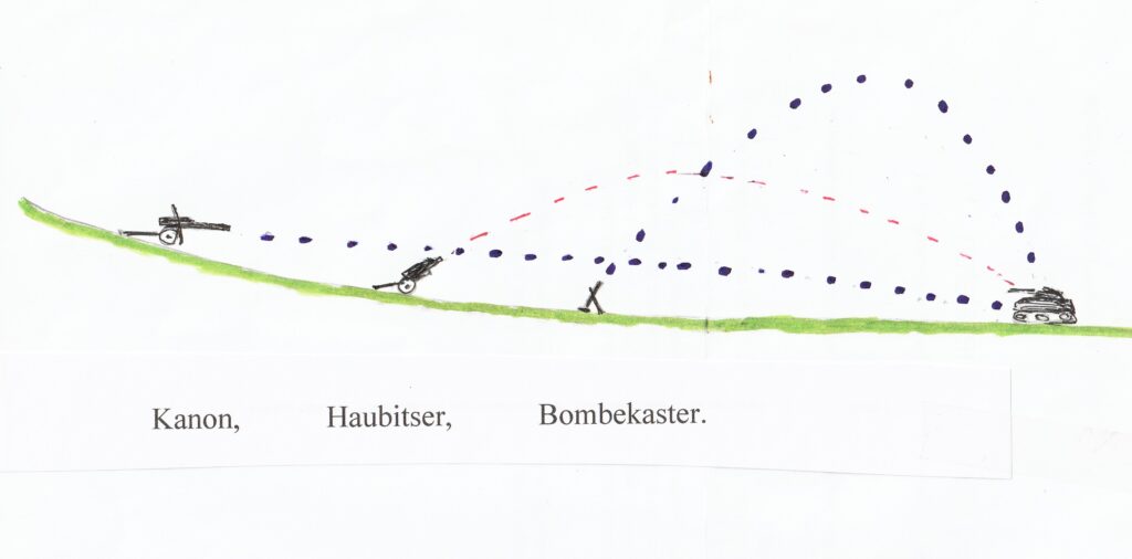 Morteren eller bombekasteren. Ett krumbane skyts som ikke var avhengig av at målet kunne sees fra skytset. Prosjektilet beveger seg i en krum bane og rekkevidden økes ved å senke løpet på våpenet. Dette enkle våpenet kan avfyre en stor prosjektilvekt fra et lett våpen og skuddtakten er ofte svært høy, men rekkevidden er liten og siktingen er avhengig av observatører nær fronten.